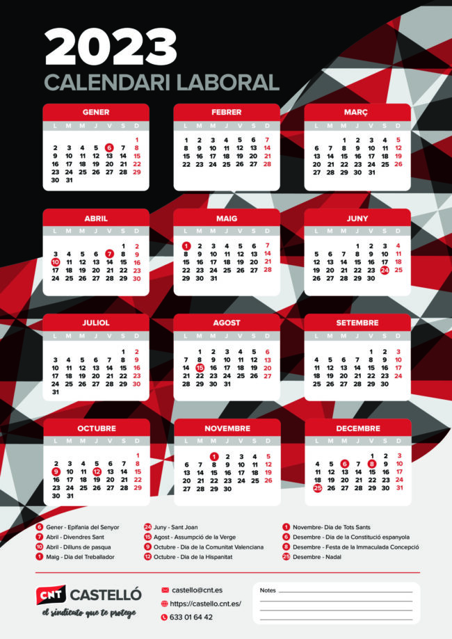 Ja pots descarregar-te el calendari laboral del 2023 al País Valencià. Només falta que apuntes els dies festius locals del municipi ón es localitza el teu centre de treball.